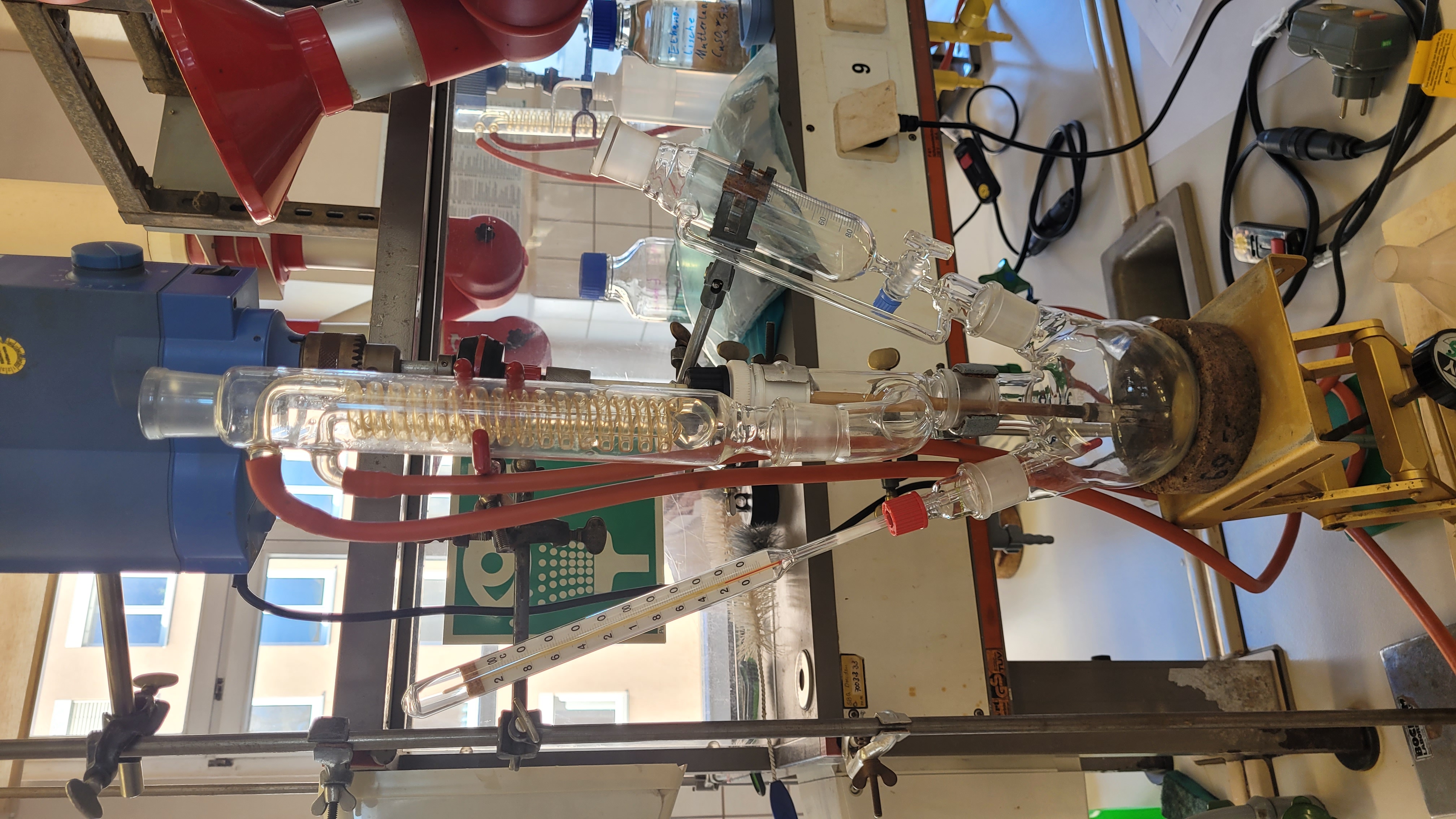 - Es sollte in einem Dreihalskolben mit Thermometer und Rückflusskühler gearbeitet werden.